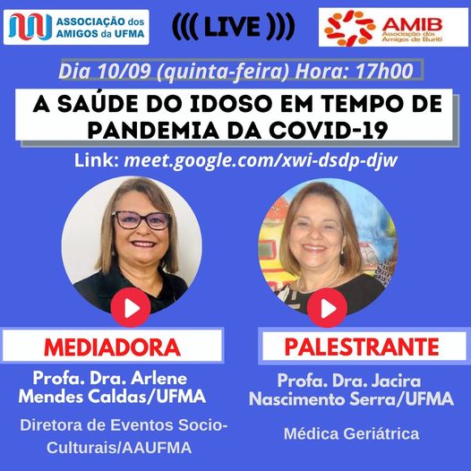 A Associação dos Amigos da UFMA (AAUFMA) e a Associação dos Amigos de Buriti (AMIB) realizarão, nessa quinta-feira, 10, uma live com o tema “Saúde do idoso em tempo de pandemia da Covid-19”, com a participação da Geriatra e professora do departamento de Medicina da UFMA, Jacira do Nascimento Serra, e da professora do departamento de Enfermagem, Arlene Mendes Caldas, Diretora de Eventos Sócio-Culturais da AAUFMA, que atuará como mediadora.