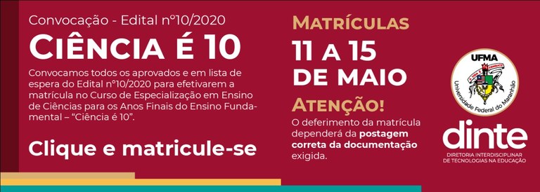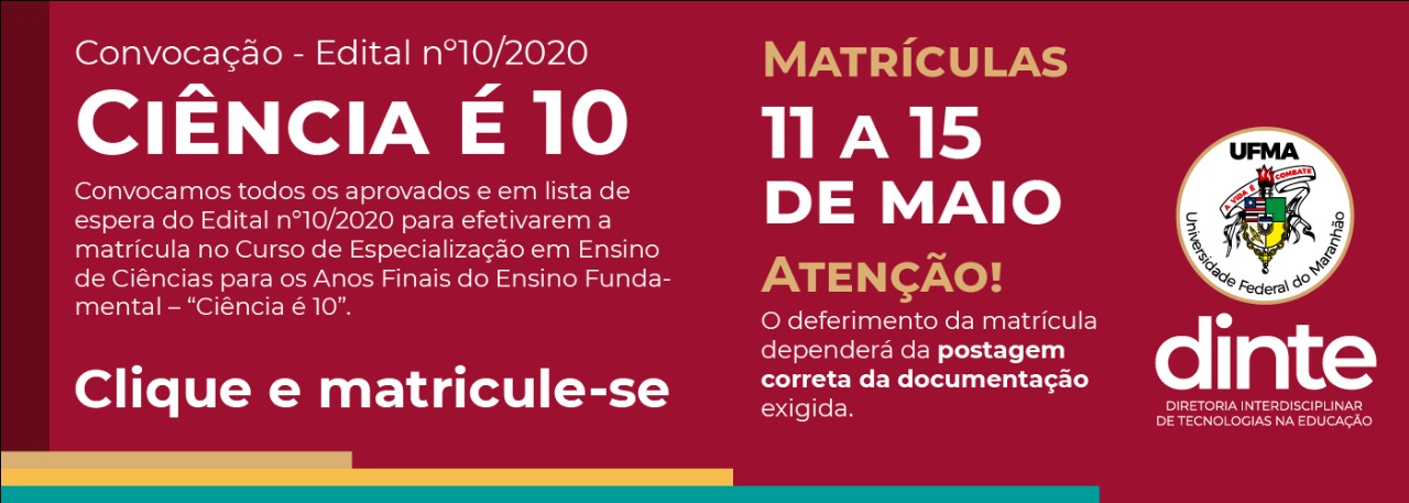 SÃO LUÍS – A Diretoria Interdisciplinar de Tecnologias na Educação (Dinte) da Universidade Federal do Maranhão convoca os aprovados no Edital Nº10/2020 para a efetivação da matrícula no “Ciência é 10”, um curso de especialização em ensino de ciências para os anos finais do ensino fundamental (6º ao 9º ano). As inscrições poderão ser feitas no site da Dinte até sexta-feira, 15.
