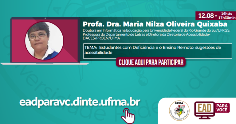 Nesse contexto, o webinário surge objetivando a abertura de espaços para discussões e sugestões de formas de gerar acessibilidade no ensino remoto para alunos com deficiência. Para isso, o evento contará como palestrante com a professora Maria Nilza Oliveira Quixaba, do Departamento de Letras e Diretora de Acessibilidade da UFMA. Além disso, ela é doutora em Informática pela Universidade Federal do Rio Grande do Sul.
