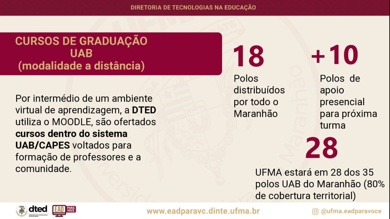 A UAB, que está em 35 municípios no Maranhão, foi instituída para desenvolver a modalidade de educação a distância com o objetivo de expandir e interiorizar a oferta de cursos de nível superior no Brasil. Tendo atualmente 2.338 mil alunos matriculados, a previsão é de ofertar mais mil e setecentas vagas para o próximo semestre letivo. Os novos polos apoiados pela nova gestão da UFMA contemplam os municípios de Cururupu, Grajaú, Cândido Mendes, Penalva, Alto Parnaíba, Pastos Bons, Loreto, Santa Quitéria, Urbano Santos e Paraibano.