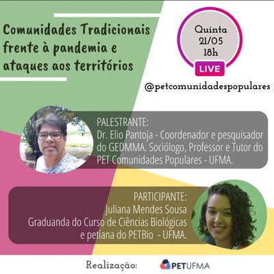 Os grupos do Programa de Educação Tutorial (PET) da Universidade Federal do Maranhão (PET UFMA) promovem nesta quinta-feira, 21, a partir das 18h, uma live com o tema “Comunidades Tradicionais frente à pandemia e ataques aos territórios”, que contará com o palestrante Elio de Jesus Pantoja Alves, docente do Departamento de Sociologia e Antropologia da UFMA e tutor do PET Comunidades Populares, sob a mediação de Juliana Mendes Sousa, acadêmica do curso de Ciências Biológicas da UFMA e membra do PET de Biologia.