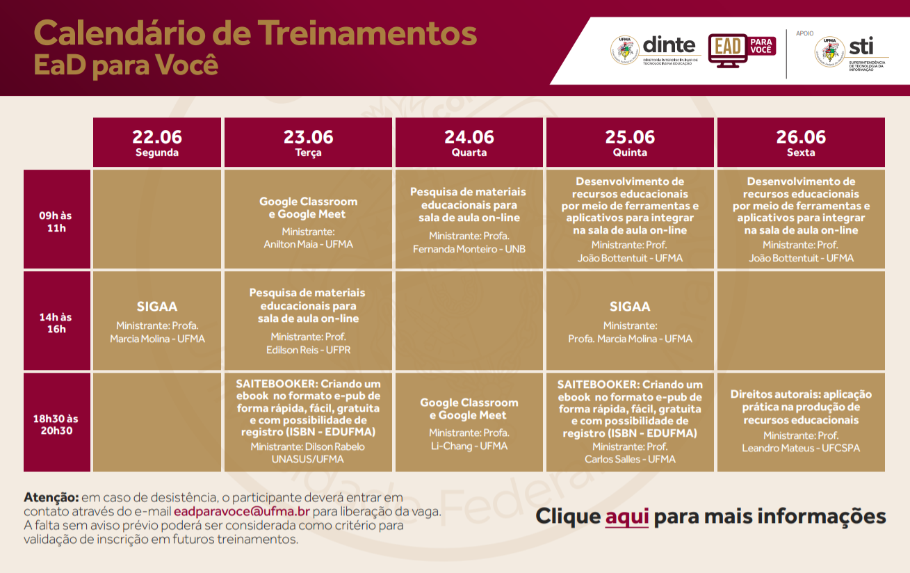 Para ampliar o conhecimento na esfera das tecnologias na educação e subsidiar a elaboração, construção e oferta das disciplinas para o ensino remoto, a Diretoria Interdisciplinar de Tecnologias na Educação (Dinte), por meio do projeto “EAD Para Você’” e em parceria com a Superintendência de Tecnologia da Informação (STI), disponibiliza aos docentes da UFMA treinamentos práticos on-line ao longo do mês de junho, ofertando um total de seis treinamentos, com duas horas cada, sendo cinco deles realizados por duas vezes durante a semana.