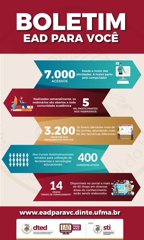 Com a pandemia do novo coronavírus, a Universidade Federal do Maranhão buscou meios para que as atividades não parassem totalmente. Para isso, a Diretoria de Tecnologias na Educação (DTED-UFMA) desenvolveu o Projeto EaD para Você, que atingiu números expressivos recentemente, promovendo o desenvolvimento de conhecimentos no âmbito das tecnologias na educação, por meio de informações, cursos, treinamentos e webinários.