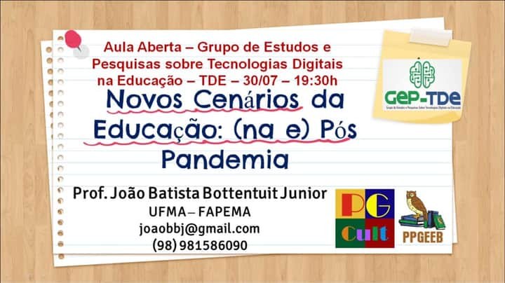 O Grupo de Estudos e Pesquisas em Tecnologias Digitais na Educação (GEP-TED), coordenado pelo professor João Batista Bottentuit Júnior, que é vinculado ao Departamento de Educação II do curso de Pedagogia da Universidade Federal do Maranhão, promoverá hoje, a partir das 19h30, em seu canal no Youtube, a aula aberta “Novos Cenários da Educação: (na e) pós-pandemia”.