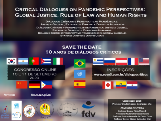 Em comemoração aos 10 anos de atividades ininterruptas, o Grupo de Pesquisa Cultura, Direito e Sociedade (DGP-CNPQ) da Universidade Federal do Maranhão, coordenado pelo professor Cássius Guimarães Chai, convida a comunidade universitária e a sociedade em geral para participar do Congresso Internacional Diálogos Críticos em Perspectivas Pandêmicas, discutindo Justiça Global, Estado de Direito e Direitos Humanos, que ocorrerá de maneira remota nos dias 10 e 11 de setembro.