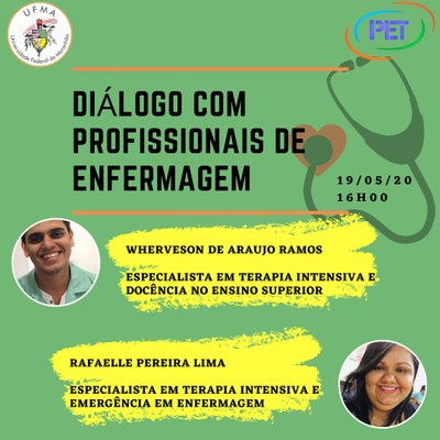 Com o objetivo de suscitar debates em torno da importância do profissional de enfermagem para a sociedade e os desafios no enfrentamento da Covid-19, o Programa de Educação Tutorial (PET) Conexões de Saberes do Câmpus de Imperatriz da Universidade Federal do Maranhão promoverá, no dia 19 de maio, com início às 16h, o “Diálogo com profissionais de enfermagem”.