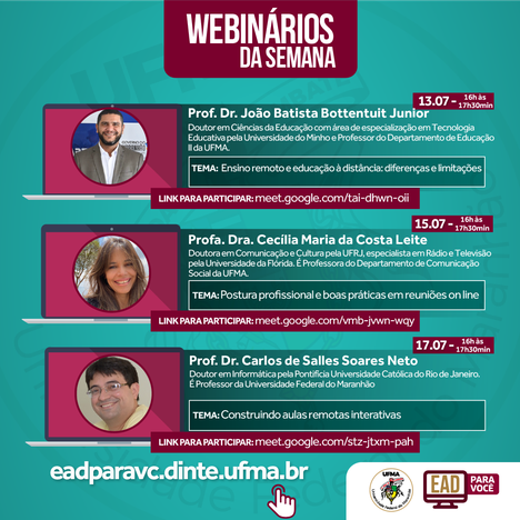 O portal “Ead para Você”, promovido pela Diretoria Interdisciplinar de Tecnologias na Educação, da Universidade Federal do Maranhão (Dinte), está promovendo os webinários “Postura profissional e boas práticas em reuniões on-line” e “Construindo Aulas Remotas Interativas”, que ocorrerão respectivamente nessa quarta-feira, 15, e na sexta-feira, 17.