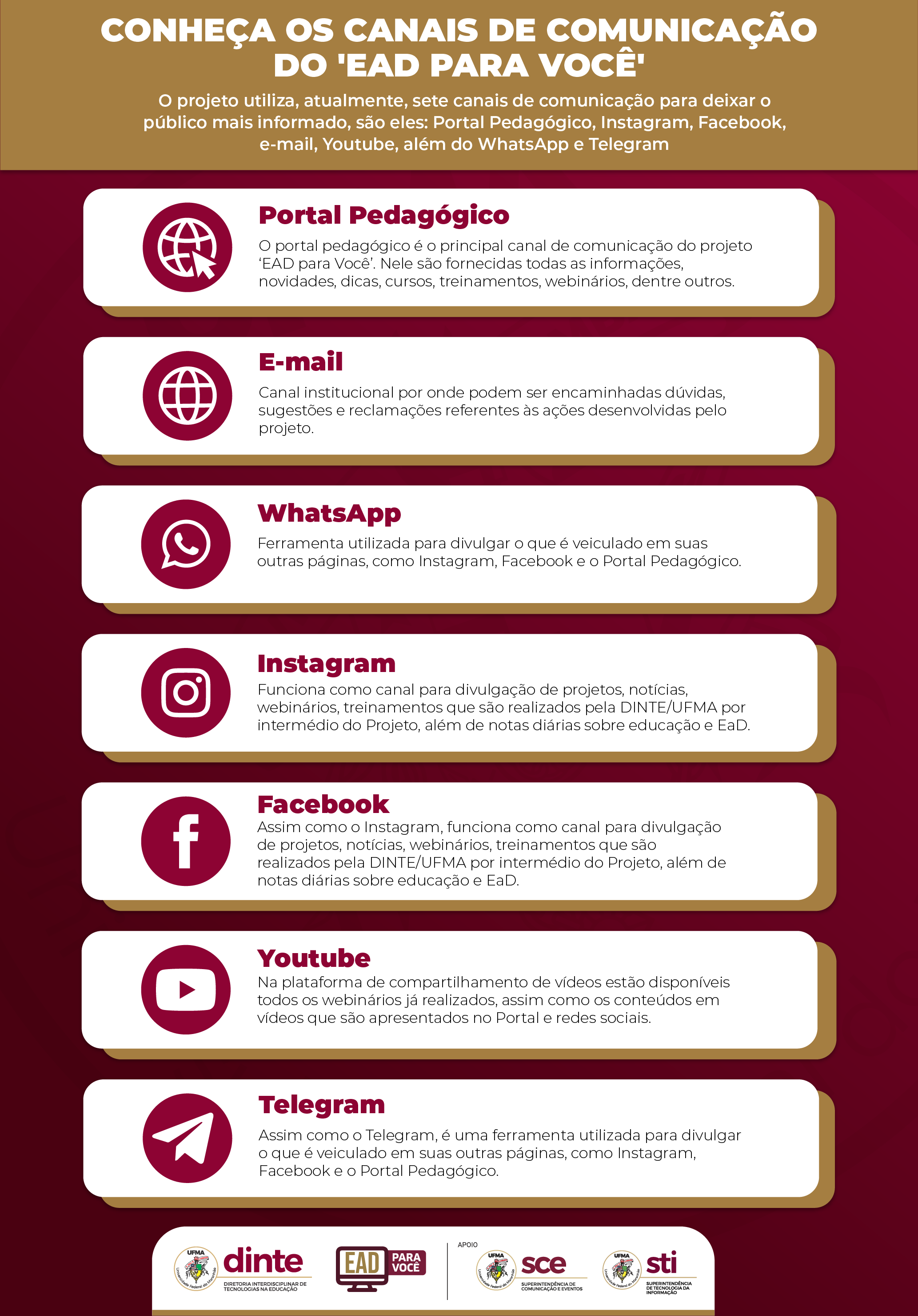 No segundo episódio da série “Por Dentro do Portal”, foram apresentados os canais de comunicação que o projeto utiliza. Entre eles, o Portal Pedagógico, Instagram, Facebook, e-mail, Youtube, WhatsApp e Telegram, que são usados para divulgação de informações, notícias, webinários, treinamentos e as ações produzidas.