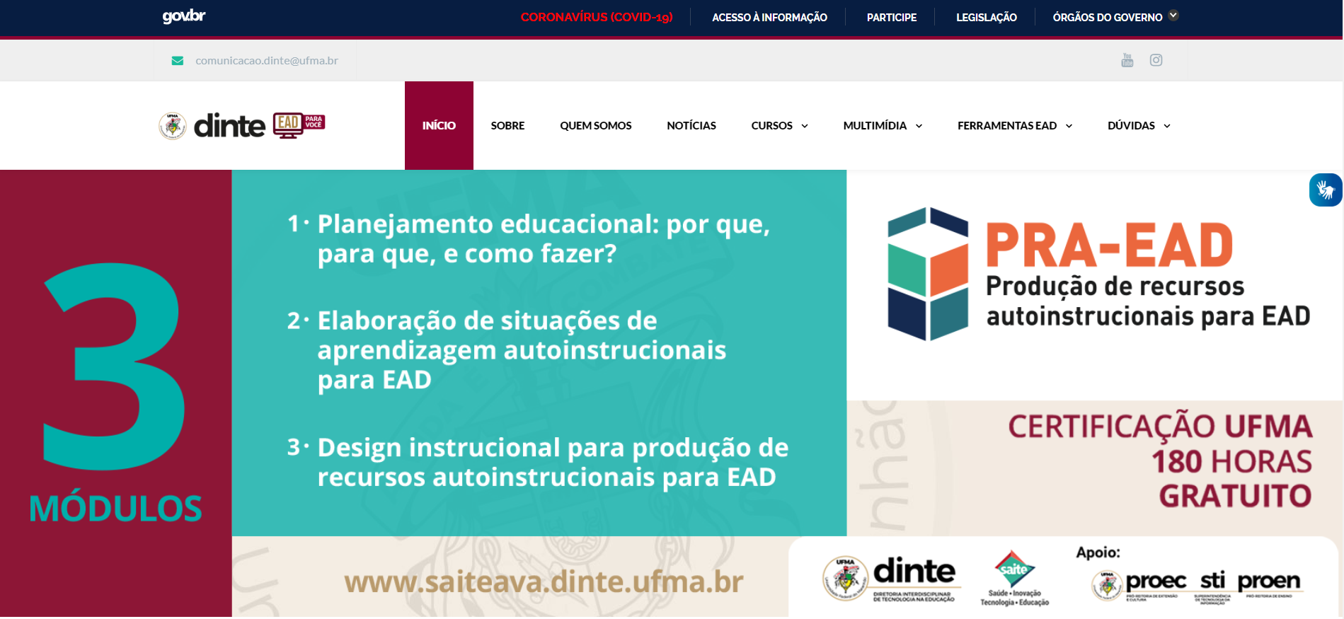 O novo site "EaD para Você" de apoio ao ensino a distância da UFMA, desenvolvido pela Diretoria Interdisciplinar de Tecnologias na Educação da Universidade Federal do Maranhão (Dinte), pode ser acessado a partir desta terça-feira, 27, no endereço eadparavc.dinte.ufma.br/. O objetivo do site é oferecer informações, na área de Tecnologia da Educação, ao corpo docente e de técnicos da UFMA, por meio de notícias, cursos, treinamentos, webinários, entre outras iniciativas educacionais.