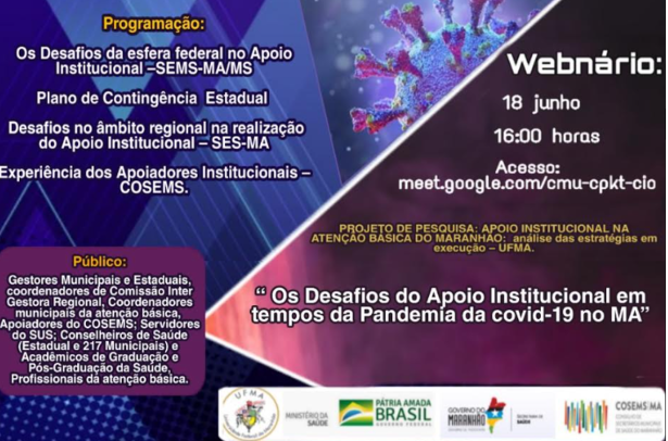 O webinário é promovido pelas instituições que integram o grupo condutor da Pesquisa “Apoio Institucional na Atenção Básica do Maranhão: análise das estratégias em execução”, em parceria com a Superintendência Estadual do Ministério da Saúde no Maranhão (SEMS-MA), com a Secretaria de Estado da Saúde do Maranhão (SES-MA) e com o Conselho de Secretarias Municipais de Saúde (Cosems).