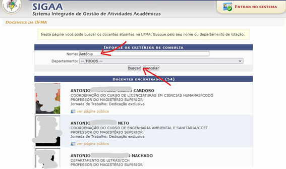 Para realizar uma busca por nome, insira no campo de busca o nome completo ou um trecho do nome desejado e clique em Buscar, após isso o SIGAA exibirá o nome de todos os docentes correspondentes à busca.