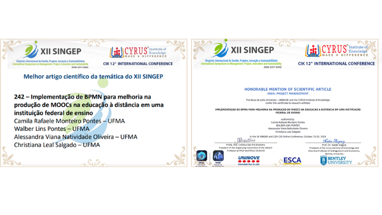O trabalho intitulado “Implementação de BPMN para melhoria na produção de MOOCs na educação à distância em uma instituição federal de ensino”, dos autores Camila Pontes, Walber Lins Pontes, Alessandra Natividade Oliveira e Christiana Salgado esteve entre os trabalhos laureados no XII SINGEP, que abordou a temática “Pesquisa científica e impacto na sociedade: contribuições para o alcance dos objetivos do Desenvolvimento Sustentável”.