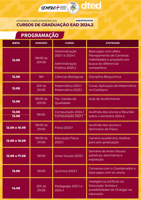 Programação de atividades encerra semestre 2024.1 e marca início do segundo semestre dos Cursos de Graduação EaD da UFMA