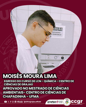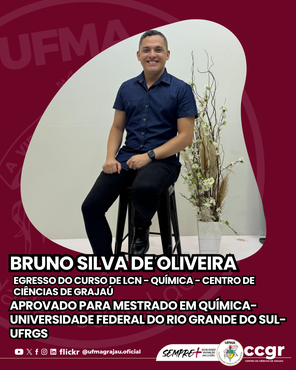 É com imensa alegria e orgulho que o Centro de Ciências de Grajaú (CCGR-UFMA) parabeniza os egressos do Curso de Licenciatura em Ciências Naturais - Química, Bruno Silva de Oliveira e Moisés Moura Lima, pelo ingresso em programas de Mestrado no segundo semestre de 2025.
