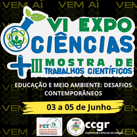 A Diretora do de Ciências de Grajaú da Universidade Federal do Maranhão, no uso de suas atribuições legais, e o Grupo PET Ciências Naturais Interdisciplinar tornam público o presente edital, contendo as normas e as etapas para realização de inscrição, seleção e classificação de propostas de apresentação de trabalhos, na modalidade de Painel (banner/pôster) e Exposição de Projetos Científicos durante o evento VI EXPOSIÇÃO DE CIÊNCIAS (VI EXPOCIÊNCIAS) e III MOSTRA DE TRABALHOS CIENTÍFICOS (III MTC) 2024, que acontecerá nas dependências do Centro de Ciências de Grajaú/UFMA, com o tema “Educação e Meio Ambiente: Desafios Contemporâneos”.