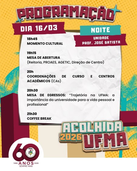 A programação de acolhida marca oficialmente o início das atividades acadêmicas do semestre 2026.1 e reforça o compromisso da UFMA com a formação cidadã, acadêmica e profissional de seus estudantes. Toda a comunidade acadêmica está convidada a participar.