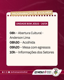 Em ambas programações haverá atividade cultural com o cantor Anderson Lima; em seguida, acolhida do Diretor de Centro, coordenadores de cursos e Centros Acadêmicos. Na sequência haverá a mesa “Trajetória na UFMA: a importância da Universidade para a vida pessoal e profissional”, com depoimentos de egressos da instituição. Também haverá explicações sobre setores da instituição como Assistência Estudantil e Biblioteca.