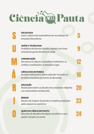 A nova edição aborda pesquisas realizadas no âmbito da pós graduação da UFMA Imperatriz e reúne reportagens sobre temas diversos e estratégicos para a região amazônica, entre eles: saberes tradicionais e insumos naturais da floresta; jornalismo ambiental e os conflitos invisibilizados na Amazônia Legal; bebidas vegetais e probióticas produzidas com frutos da floresta; presença e permanência de indígenas nas universidades; e a luta histórica das quebradeiras de coco babaçu na Amazônia Maranhense.