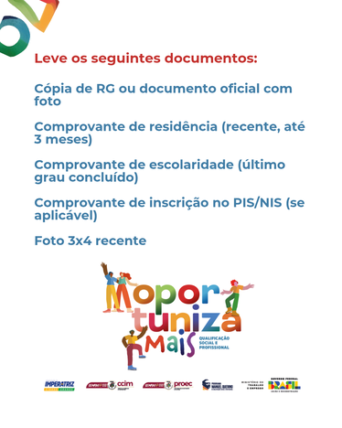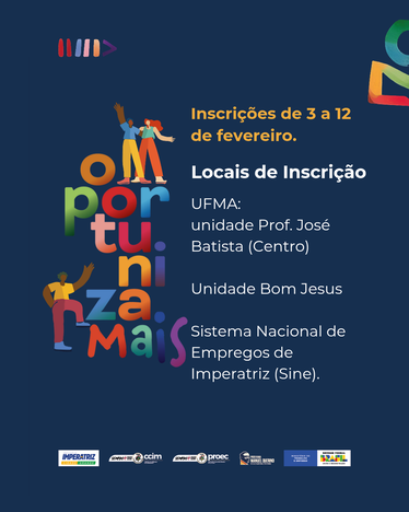Estão abertas as inscrições para os cursos de qualificação profissional no período de 03 a 12 de fevereiro, em Imperatriz, em modo presencial. Os alunos deverão comparecer a um dos três locais de inscrição: na UFMA, nas Unidades do Centro (Rua Urbano Santos, ao lado da Câmara de Vereadores) e do Bom Jesus (na Avenida Bayma Júnior) e no Sine Municipal (que fica no Estádio Frei Epifânio). As inscrições serão realizadas das 8h às 12h e das 14h às 18h, nas unidades da UFMA e das 8h às 12h, no Sine Municipal.