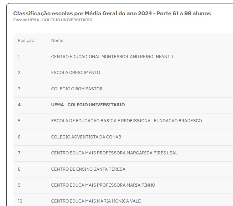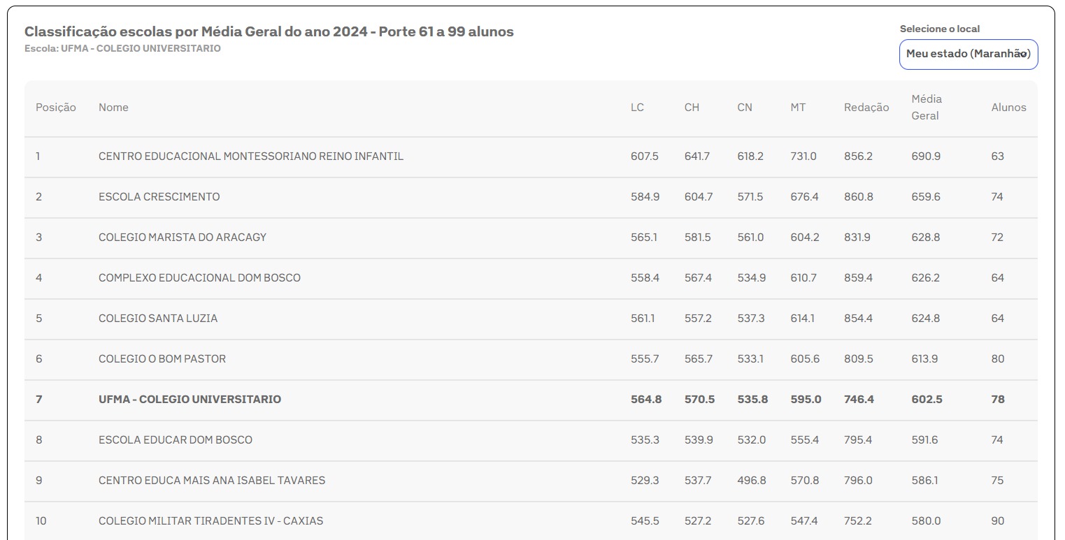 Já ao considerar as escolas de São Luís, o Colun se destaca na quarta posição entre instituições públicas e privadas.