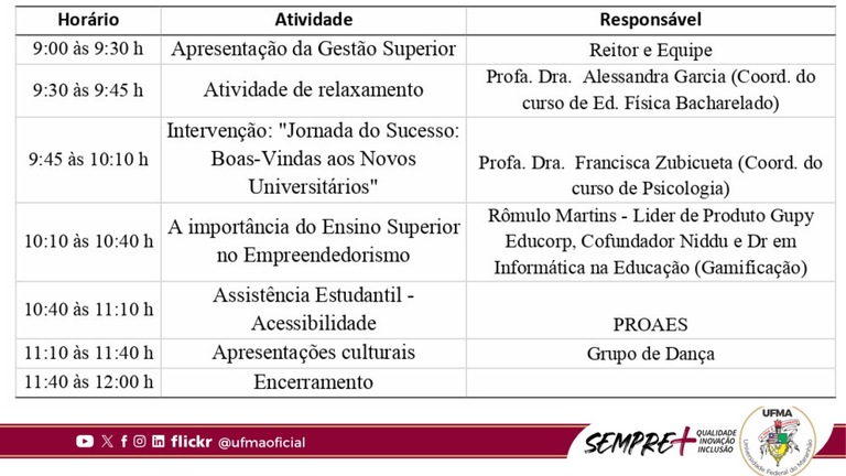 Dentro desse escopo de atividades realizadas em todos os câmpus da UFMA, a Gestão Superior realizará a abertura oficial da acolhida no dia 18 de março, na Cidade Universitária, em São Luís, e transmitirá ao vivo para todos os demais centros. O reitor da universidade fará a acolhida oficial no Auditório Central do Câmpus São Luís às 9h da manhã, seguida por uma programação que contará com atividades de relaxamento, palestras sobre a importância do Ensino Superior no empreendedorismo e atividades culturais.
