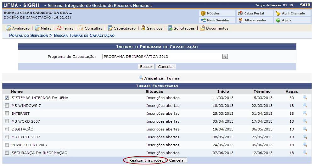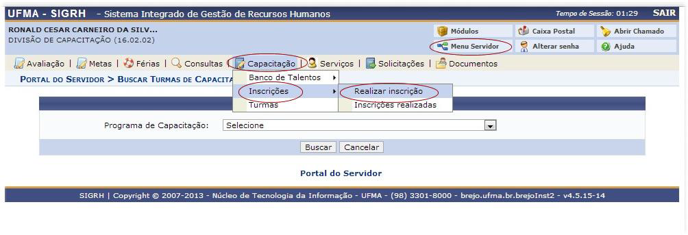 1 – Acesse o SIGRH, navegue até o Menu Servidor -> Capacitação -> Inscrições -Realizar inscrição.