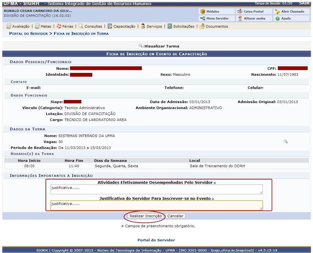 4 – Na tela seguinte, preencha os campos obrigatórios para finalizar a inscrição. Após isso, clique em realizar inscrição.