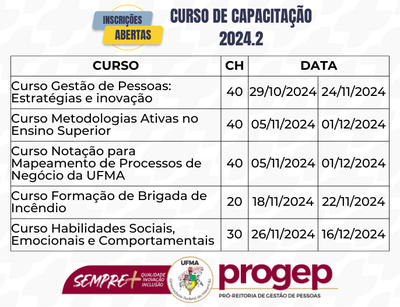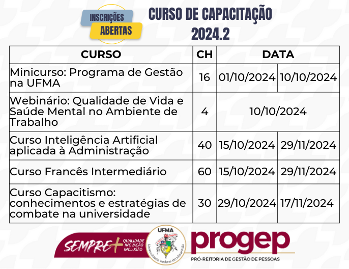 A PROGEP informa que a programação dos cursos de capacitação 2024.2 foi retomada, em virtude da liberação do recurso destinado às ações de capacitação e desenvolvimento.