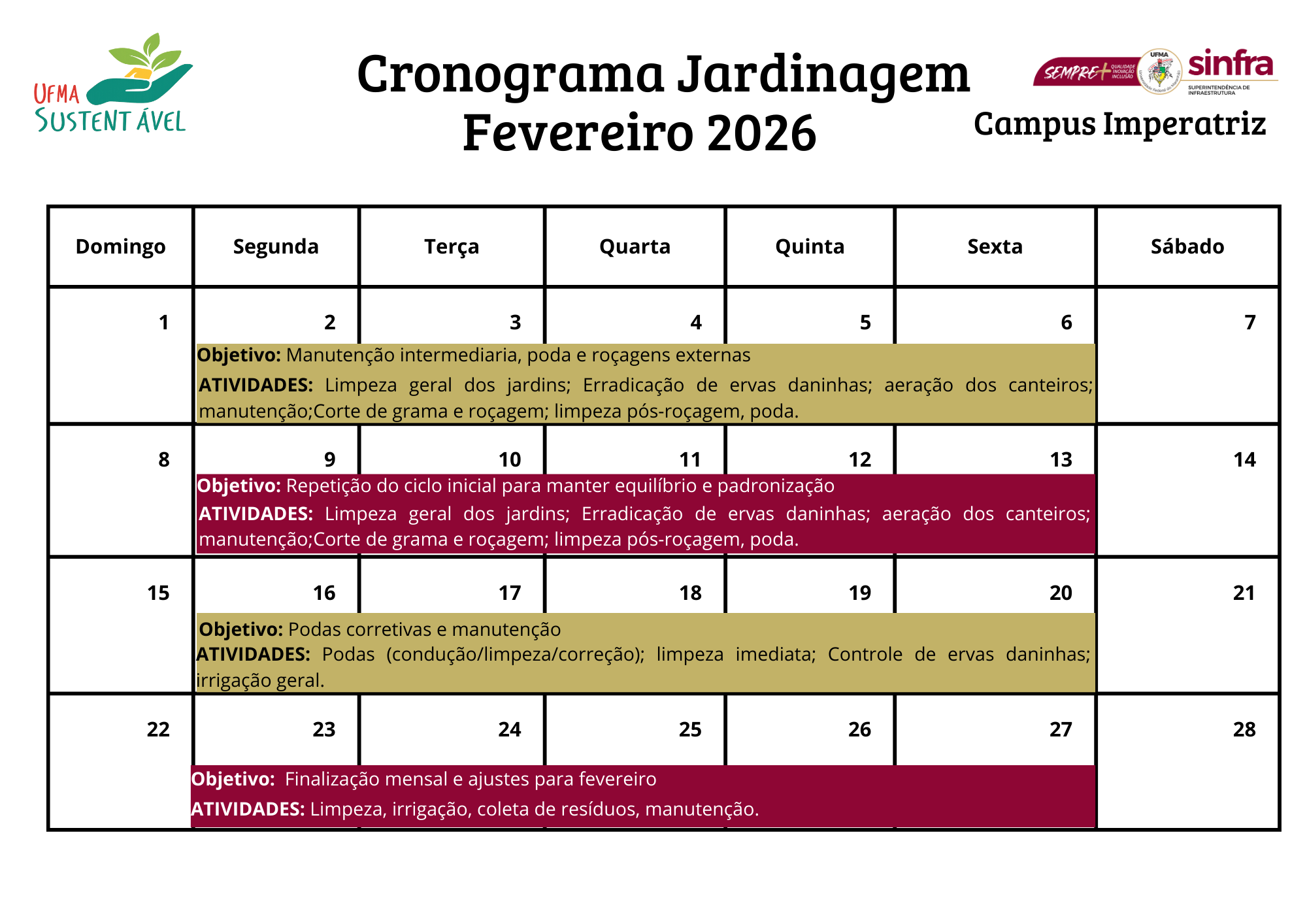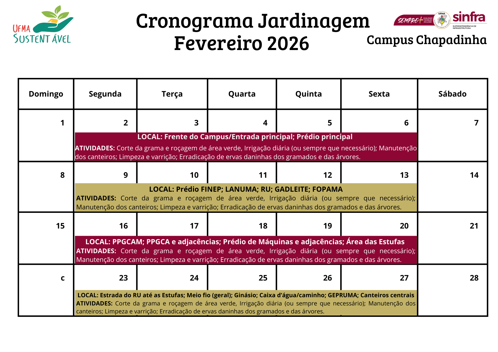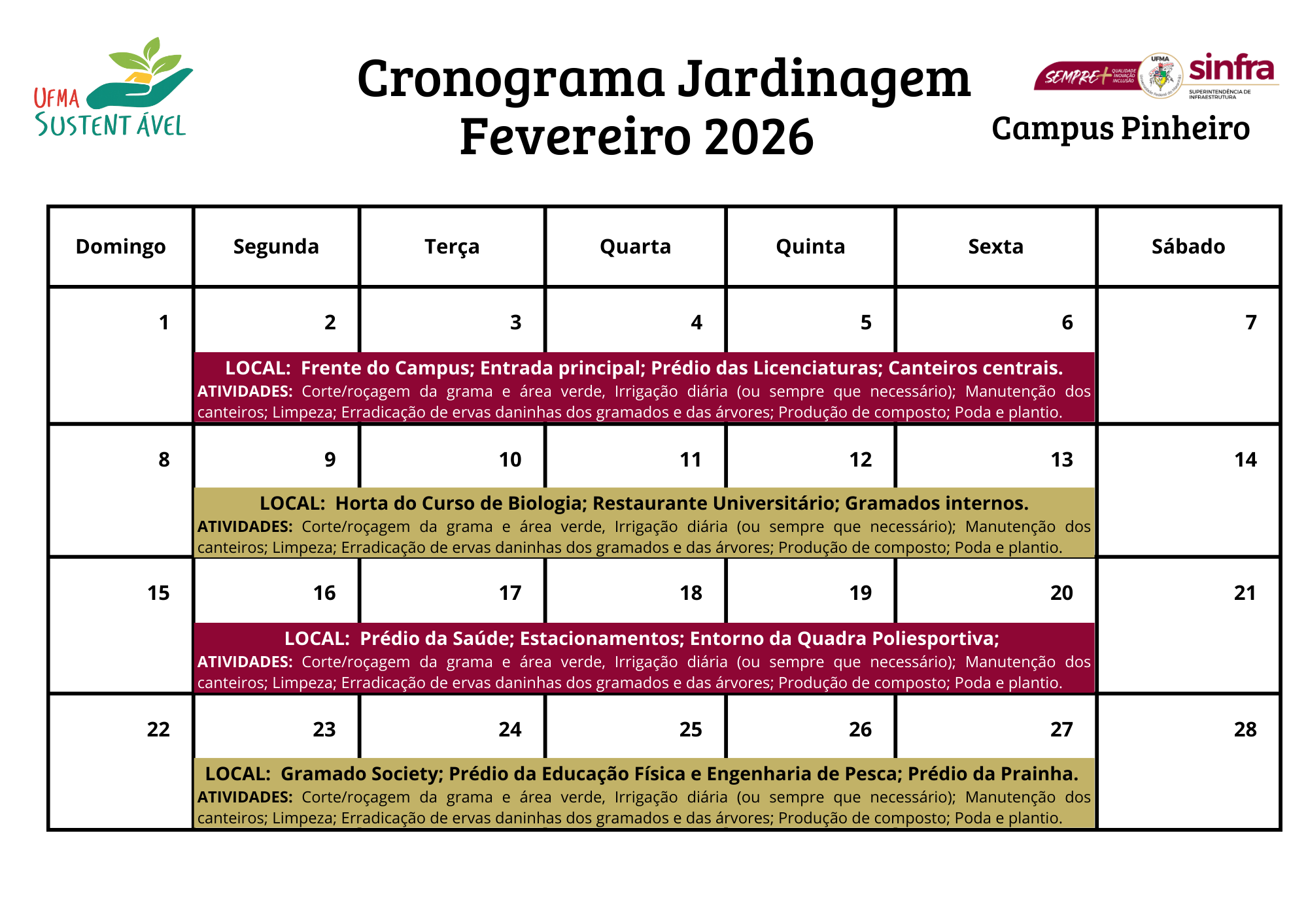 📅 Atenção, Comunidade UFMA! O Cronograma da Jardinagem de Fevereiro já está disponível !