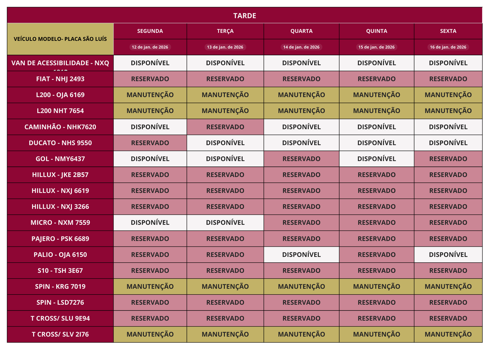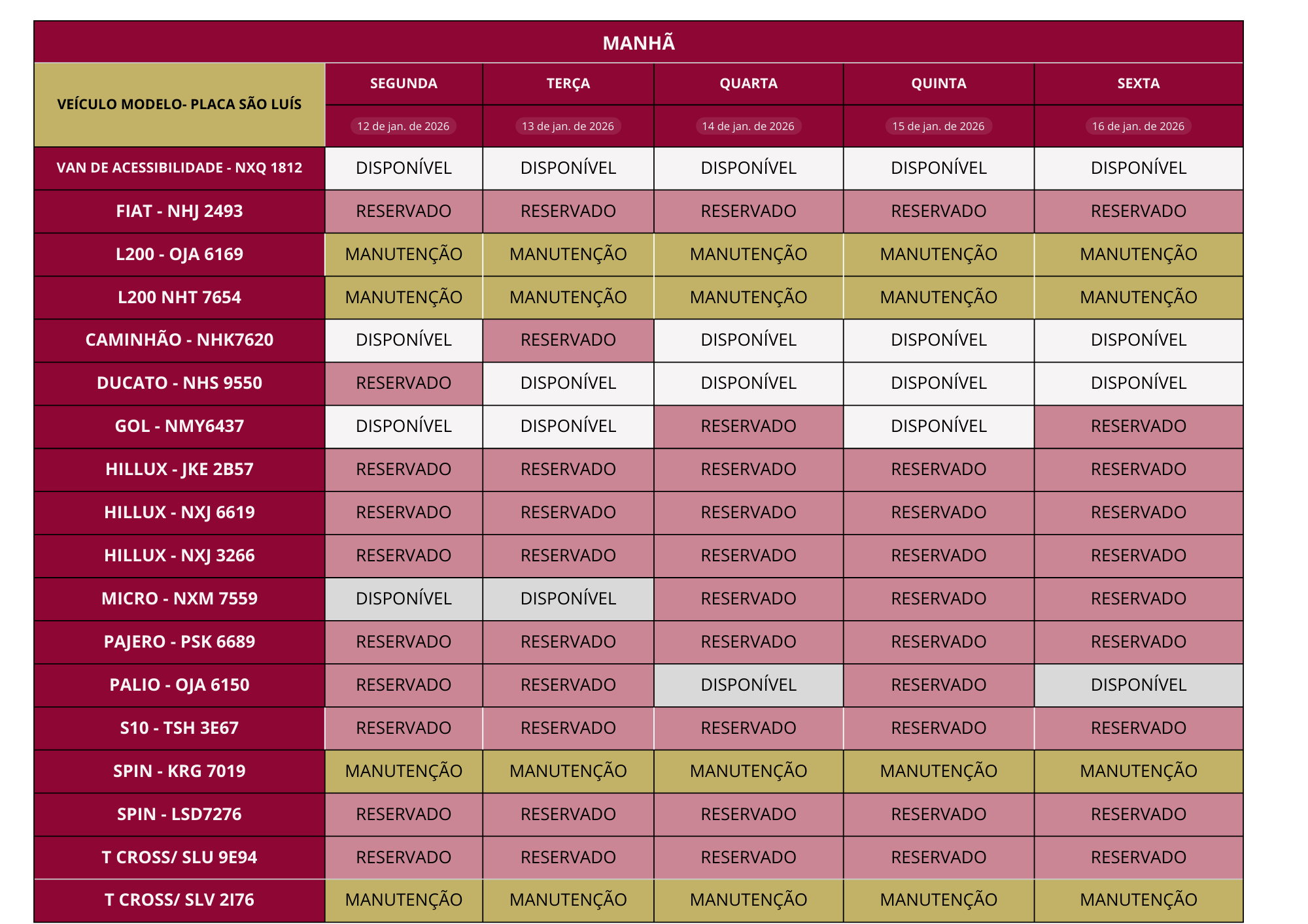 Para dar transparência e visibilidade à gestão dos nossos recursos, disponibilizamos o cronograma de uso da nossa frota para a semana de 12 a 16 de Janeiro