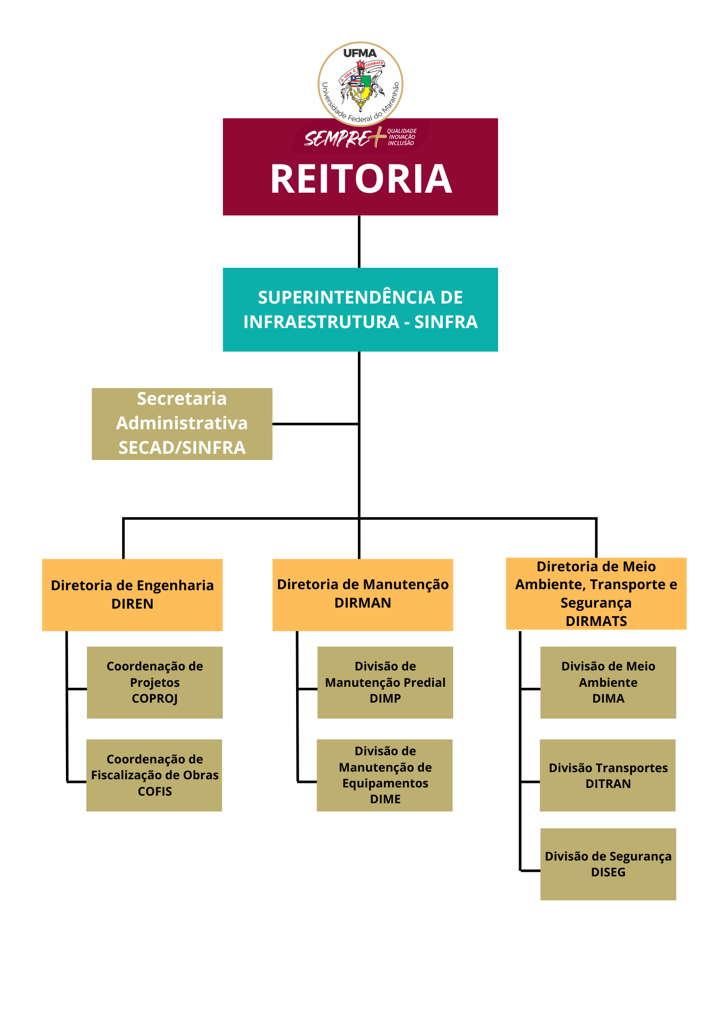 A Superintendência de Infraestrutura – SINFRA é representada da seguinte forma, conforme RESOLUÇÃO N° 381-CONSAD, de 02 de dezembro de 2025 que modifica a estrutura organizacional de unidades administrativas da Universidade Federal do Maranhão.