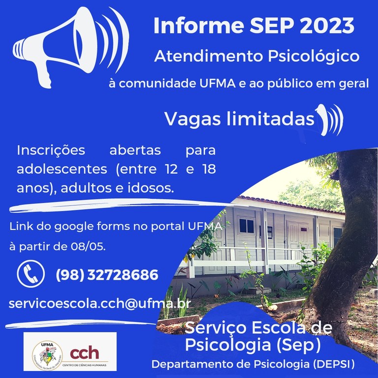 O Serviço Escola de Psicologia (SEP), vinculado ao Departamento de Psicologia (Depsi) do Centro de Ciências Humanas (CCH), abriu, nesta segunda-feira, 8, a segunda etapa de inscrições para atendimento psicológico à comunidade interna e externa à Universidade Federal do Maranhão. As vagas são limitadas, e as inscrições devem ser realizadas via formulário Google Forms.