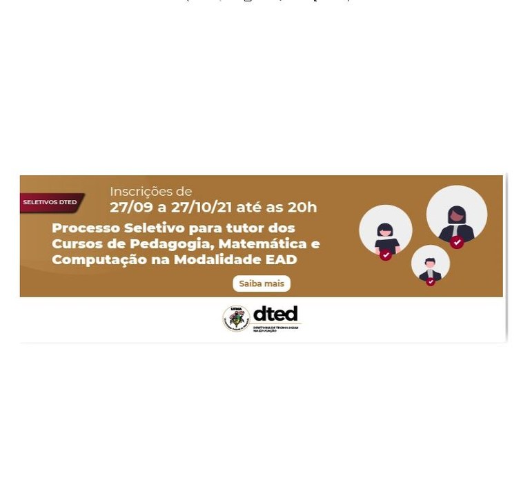 A Diretoria de Tecnologia na Educação (DTED) da Universidade Federal do Maranhão comunica que estão abertas, até o dia 27 deste mês, as inscrições para o processo seletivo simplificado para tutor do Programa Sistema Universidade Aberta do Brasil (UAB), vinculado à Coordenação de Aperfeiçoamento de Pessoal de Nível Superior (Capes) do Ministério da Educação (MEC). As vagas são para os cursos de Pedagogia, Matemática e Computação na modalidade Educação a Distância (EaD) e a avaliação dos candidatos consiste em análise curricular.
