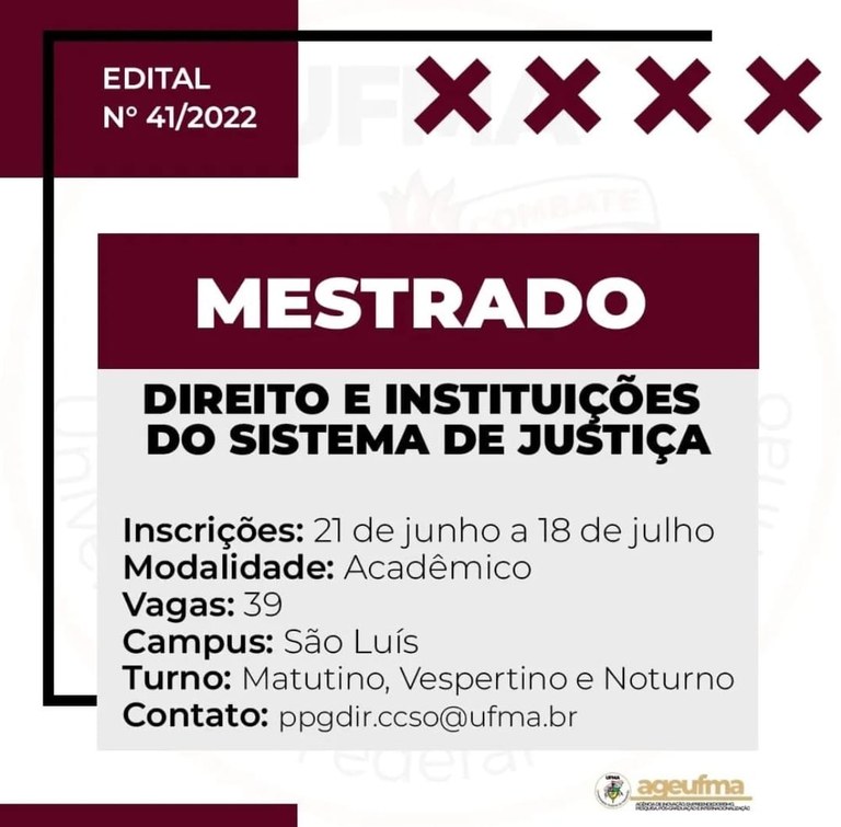 A Agência de Inovação, Empreendedorismo, Pesquisa, Pós-Graduação e Internacionalização (Ageufma) publicou Edital de abertura de inscrições para seleção do curso de Mestrado em Direito e Instituições do Sistema de Justiça, que irão até o dia 18 de julho e devem ser realizadas pelo Sigaa.
