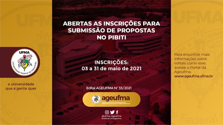 A Agência de Inovação, Empreendedorismo, Pesquisa, Pós-Graduação e Internacionalização (Ageufma) anunciou que estão abertas as inscrições ao Programa Institucional de Bolsas de Iniciação em Desenvolvimento Tecnológico e Inovação (Pibiti), que deverão ser realizadas por meio do Sistema Integrado de Gestão Acadêmica (Sigaa), até o dia 31 deste mês.