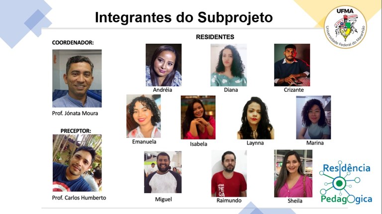 De acordo com o supervisor docente do subprojeto, Jónata Ferreira de Moura, os residentes pedagógicos produziram as aulas para os alunos do 5º ano da Escola Municipal Madalena de Canossa sob a orientação do professor da turma, Carlos Humberto Silva de Sousa, que exerce a função de preceptor dentro do programa. Preceptor é um formador que tem atividades a serem cumpridas e recebe bolsa-auxílio.