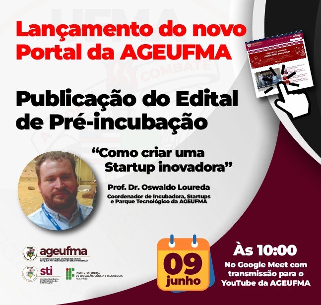 A Agência de Inovação, Empreendedorismo, Pesquisa, Pós-Graduação e Internacionalização da UFMA (Ageufma) comunica que serão oficialmente lançados, na próxima quinta-feira, 9, o novo portal da Ageufma e o Edital de Pré-Incubação de Ideias e Negócios Inovadores da Diretoria de Empreendedorismo (Demp).
