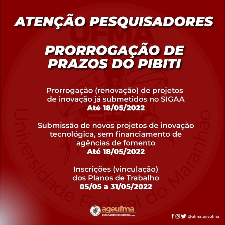 A Agência de Inovação, Empreendedorismo, Pesquisa, Pós-graduação e Internacionalização (Ageufma) divulgou a prorrogação de prazos para submissão de projetos de pesquisa ou inovação tecnológica sem financiamento de agências de fomento científico que buscam participar do edital de seleção de bolsas do Programa Institucional de Bolsas de Iniciação em Desenvolvimento Tecnológico e Inovação (Pibiti).