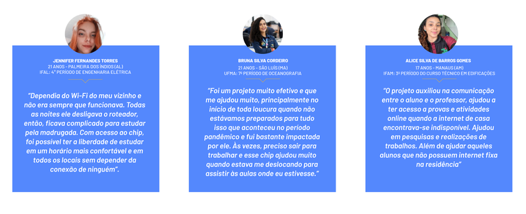 Foco da iniciativa, os alunos contemplados puderam usufruir os benefícios que os chips de pacote de dados móveis proporcionam com o acesso à internet de maneira remota durante o isolamento social, no período em que as instituições de ensino permaneceram fechadas por causa da pandemia. Veja alguns depoimentos!