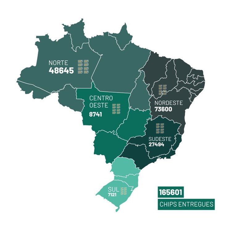 Ao todo, a RNP foi responsável pela entrega de mais de 165 mil chips para 101 instituições espalhadas pelas 27 unidades federativas. Confira o número de chips por região!