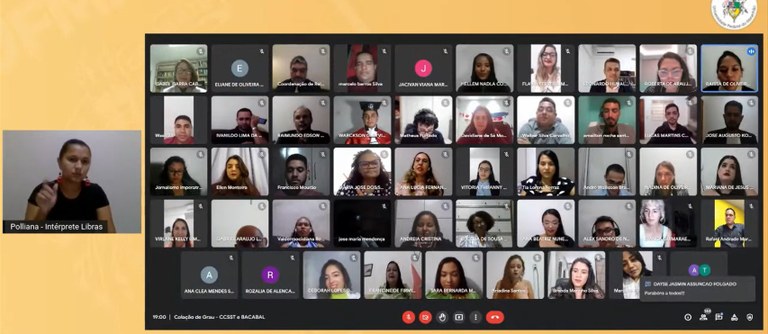 Na terça-feira, 29, foi realizada, por meio de videoconferência e com transmissão pelo Canal Institucional da UFMA no Youtube, a Solenidade de Colação de Grau do Centro de Ciências, Educação e Linguagens (CCEL) do Câmpus de Bacabal e do Centro de Ciências Sociais, Saúde e Tecnologias (CCSST) do Câmpus de Imperatriz, referente ao segundo semestre de 2021. A cerimônia foi presidida pela pró-reitora de Ensino (Proen), Isabel Ibarra Cabrera, que representou o reitor Natalino Salgado na ocasião.