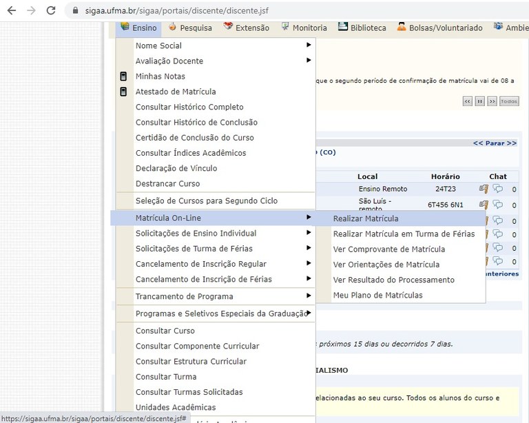 A atividade possivelmente mais importante é a matrícula nas disciplinas. Para isso, é preciso ir até a aba “Ensino”, procurar a opção “Matrícula On-Line” e a seguir realizar a inscrição. Em situações normais, os calouros têm as matrículas nas disciplinas do primeiro período realizadas automaticamente pela UFMA e todas devem ser cursadas obrigatoriamente, não havendo opção de cancelamento de nenhuma delas. No entanto, neste período de pandemia, estão abertas exceções, e o discente pode escolher somente as que desejar.