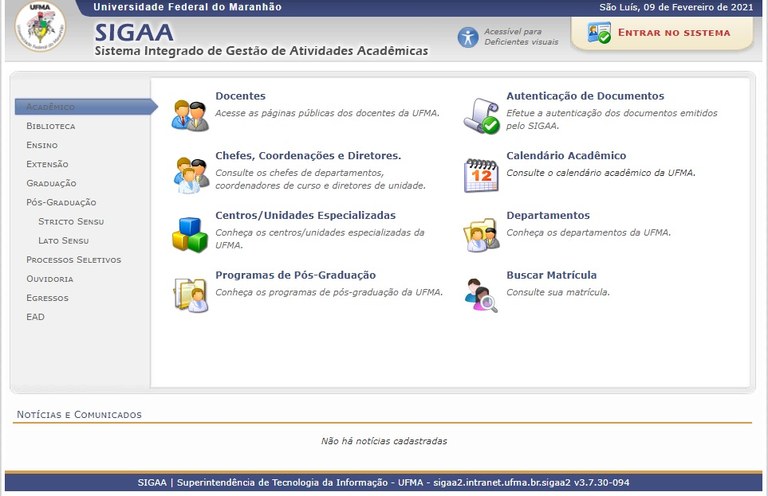 Na Universidade Federal do Maranhão, seus alunos resolvem boa parte das questões acadêmicas por meio do Sistema Integrado de Gestão de Atividades Acadêmicas (Sigaa). Por meio desse sistema, é possível realizar matrículas e cancelamentos das disciplinas, consultar estrutura curricular do curso, índices acadêmicos e histórico, além de obter comprovante de matrícula e declaração de vínculo com a Instituição, realizar cadastramento na biblioteca, solicitar auxílios, entre outras.