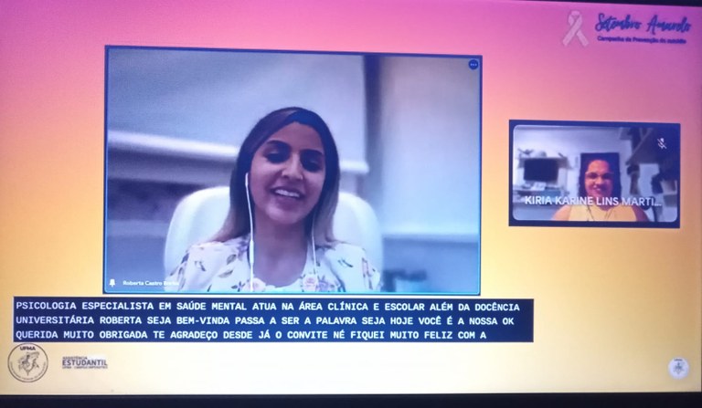 A palestra foi ministrada pela psicóloga Roberta Borba, que é especialista em Saúde Mental pela UFMA e atua como psicóloga na Prefeitura de Imperatriz, além de membra da Associação Brasileira de Psicologia e Medicina Comportamental (ABPMC). Entre os tópicos citados na palestra, foi abordada a origem do Setembro Amarelo, o aumento dos sintomas psíquicos nas últimas décadas e os transtornos mentais durante a pandemia e suas causas.