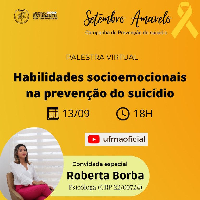 Assistência Estudantil de Imperatriz promoverá, no dia 13 de setembro, com início às 18h, uma palestra virtual sobre o desenvolvimento das habilidades socioemocionais para prevenção do suicídio