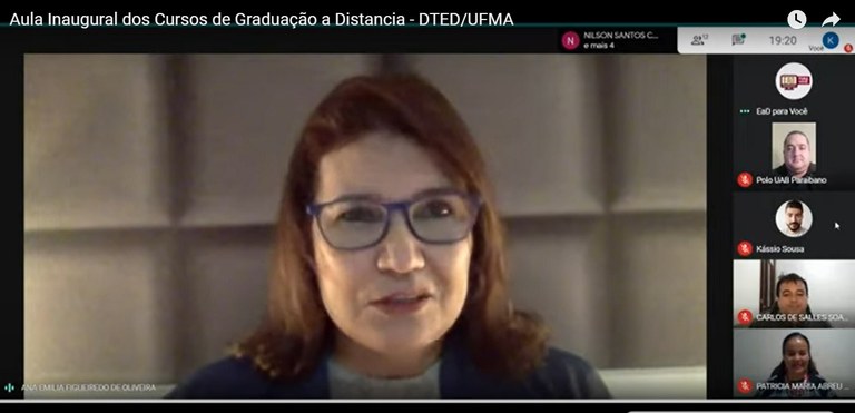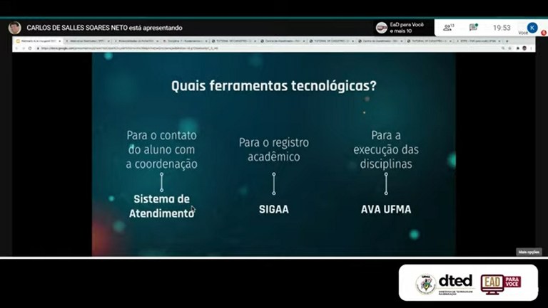 A transmissão contou ainda com um vídeo do reitor Natalino Salgado, no qual enviou uma mensagem de boas-vindas aos novos discentes e enalteceu a Universidade Federal do Maranhão e a DTED pela democratização do conhecimento e pela criação de ferramentas tecnológicas de informação e comunicação que permitiram levar a educação a outros níveis. Em seguida, foi realizada a aula inaugural “Ferramentas tecnológicas para os cursos de graduação à distância da DTED/UFMA”, ministrada pelo professor Carlos de Salles Soares Neto,