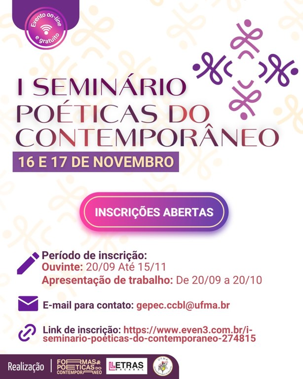O I Seminário Poéticas do Contemporâneo (Sepoc) está com inscrições abertas para ouvintes e submissão de trabalho até dia 15 de outubro. O evento ocorrerá de forma gratuita, por meio das plataformas Youtube e Google Meet, entre os dias 16 e 17 do mesmo mês. O seminário tem como temática “Olhares do contemporâneo, confluências e dissonâncias” e é organizado pelo professor Ricardo Nonato Silva, do curso de Letras do Centro de Ciências de Bacabal,