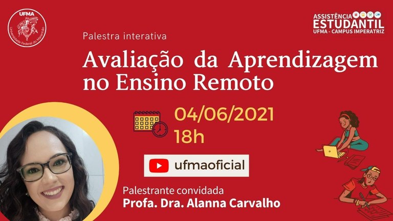 Para orientar os docentes como avaliar a aprendizagem no ensino remoto por meio de ferramentas práticas, o Câmpus Imperatriz da Universidade Federal do Maranhão realizará, no dia 4 de junho, com início às 18h, a palestra “Avaliação da Aprendizagem no Ensino Remoto”, que será ministrada pela professora Alanna Oliveira Pereira Carvalho, pelo Canal Institucional da UFMA no Youtube.