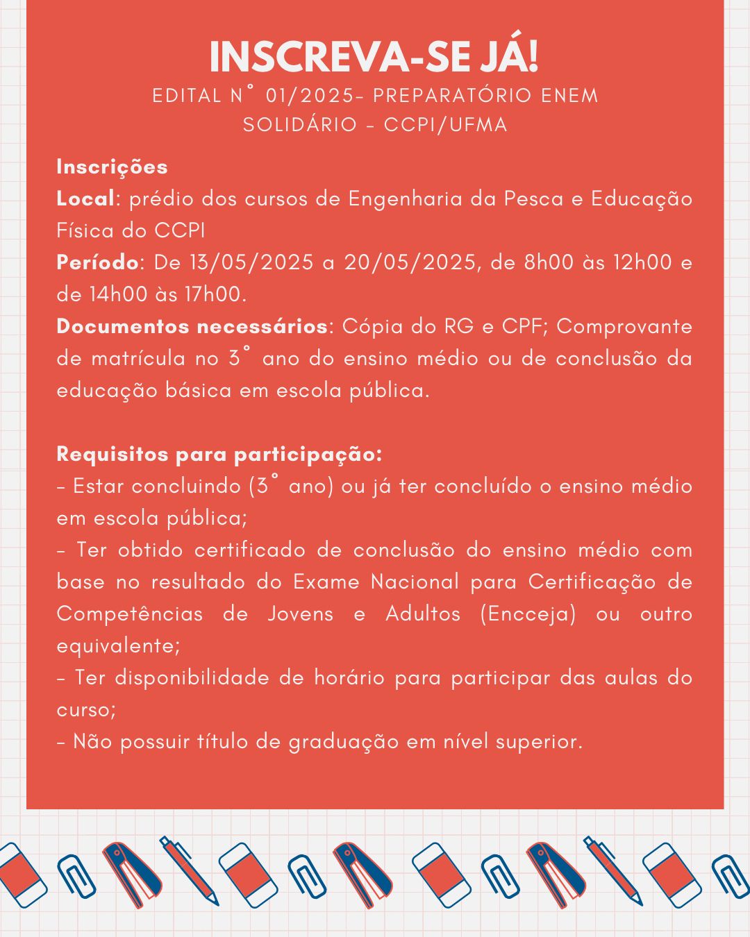 O Centro de Ciência de Pinheiro (CCPi), da Universidade Federal do Maranhão (UFMA), promove o Projeto Enem Solidário, iniciativa voltada para a educação e a responsabilidade social, que oferece aulas preparatórias gratuitas para estudantes da rede pública que desejam ingressar no ensino superior por meio do Exame Nacional do Ensino Médio (Enem). As inscrições para participar podem ser realizadas até essa terça-feira, 20 de maio, no prédio de Engenharia da Pesca e Educação Física – CCPi.