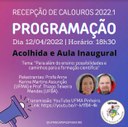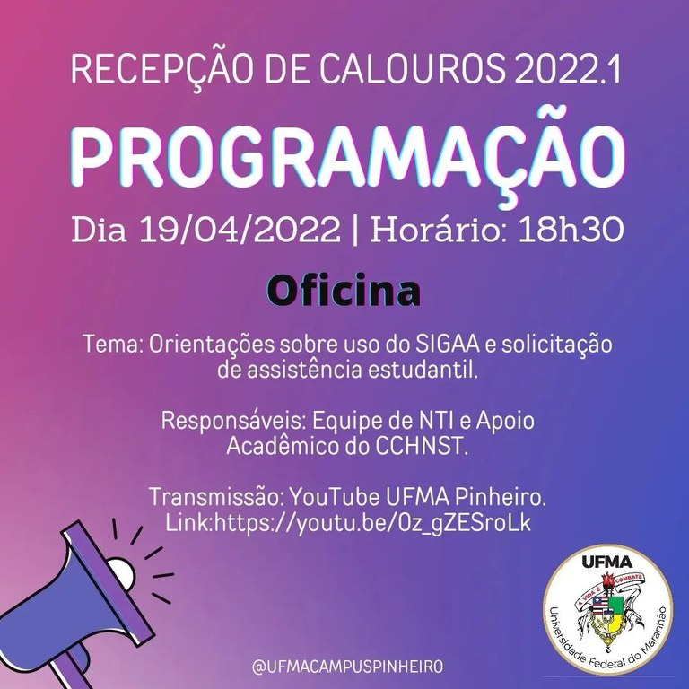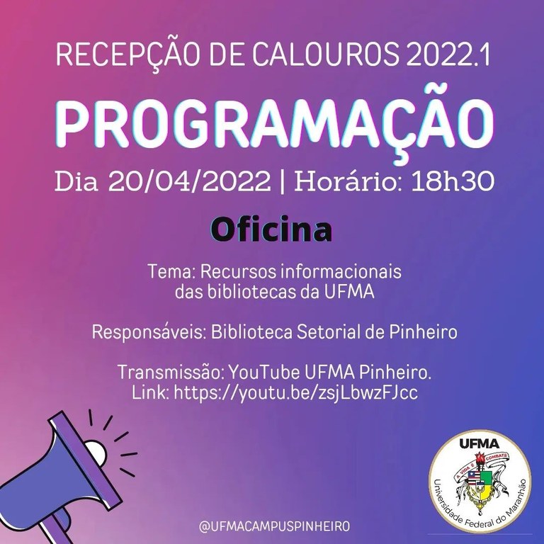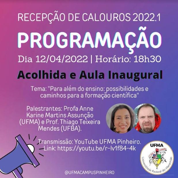 A Diretoria de Centro do Câmpus Pinheiro, em parceria com as coordenações dos cursos, realizará, nos dias 12, 19 e 20 de abril, com início às 18h30, a Recepção dos Calouros, de forma on-line, pelo canal UFMA Câmpus Pinheiro no Youtube. O evento é destinado a todos os calouros e à comunidade acadêmica.